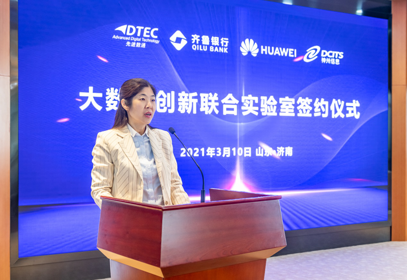 齐鲁银行副行长葛萍女士在大数据创新联合实验室揭幕仪式致辞中表示,齐鲁银行在数字化转型发展的大潮中,始终坚持以科技手段支撑服务地方经济、服务中小企业、服务城镇居民的业务发展目标,将科技赋能作为创新发展的重要驱动力,将数字化转型纳入全行发展战略规划,并确定了业务线上化、服务场景化、决策智能化、系统平台化、科技敏捷化的数字化转型目标。期望大数据创新联合实验室将成为连接齐鲁银行与大数据研发企业及研究机构的平台,为全行业务发展和数字化转型注入新的动能,打造成省内,乃至全国中小银行大数据生态合作的典范。