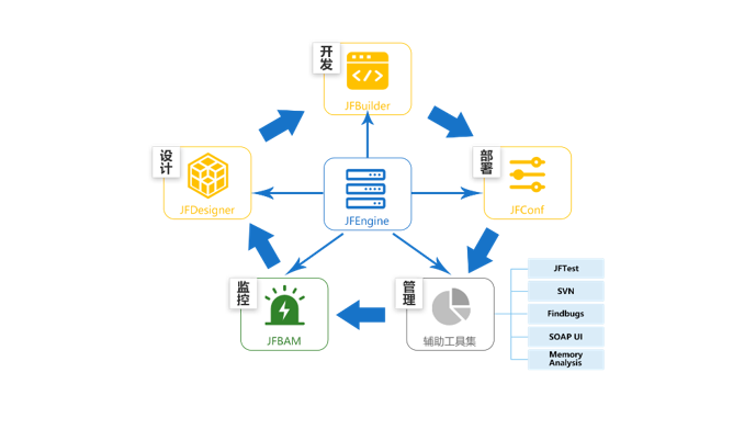 采用JAVA开发语言,支持图形化开发模式,快速构建后台应用,并提供设计、编码、编译、部署、测试等一站式服务。